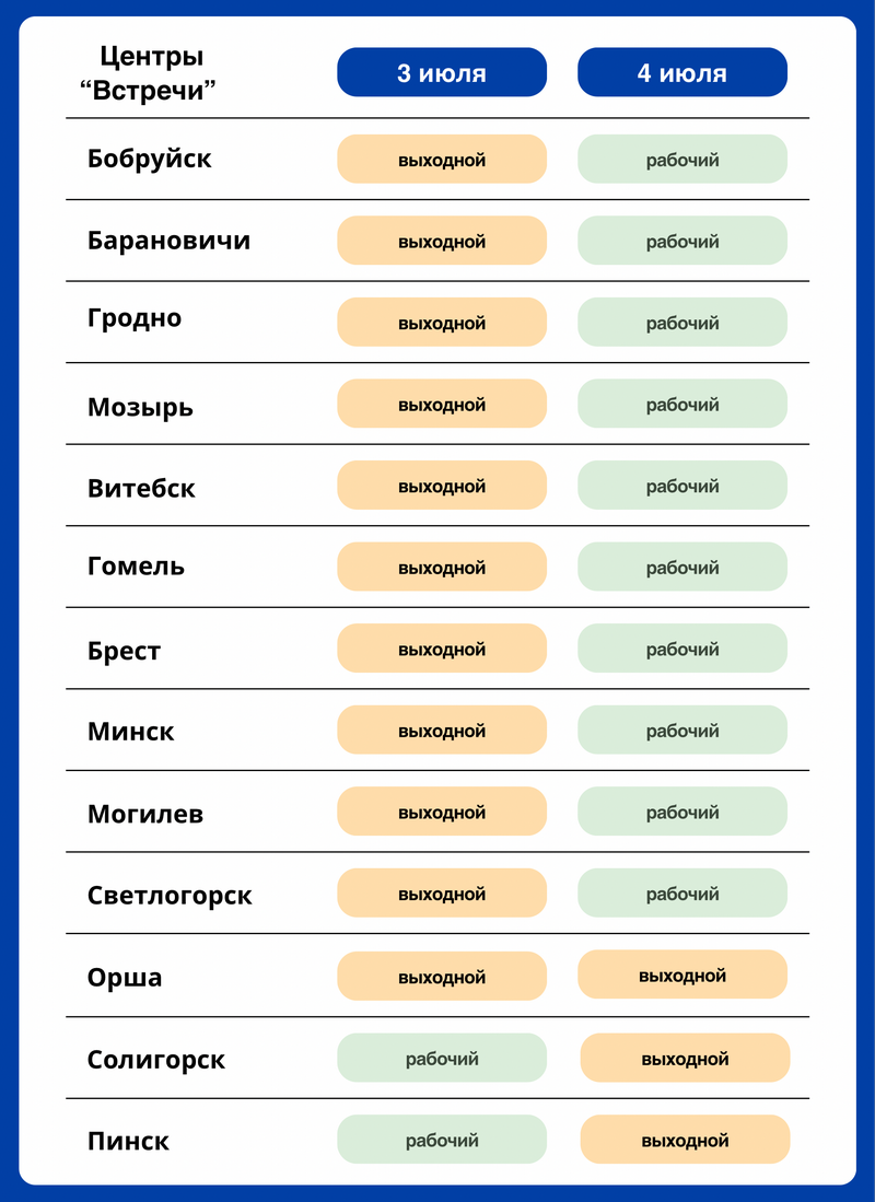 Информацию о работе всех центров «Встречи» в обычные дни можешь найти по ссылке. Также ознакомься со следующими изменениями: